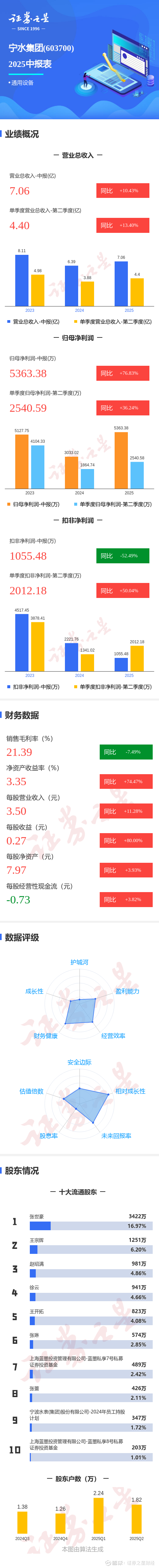 证券之星消息,宁水集团2025年中报显示,公司主营收入7.06亿元,同比上升10.44%;归母净利润5363.38万元,同比上升76.83%;扣非净利润1055.48万元,同比下降52.49%;其中2025年第二季度,公司单季度主营收入4.4亿元,同比上升13.4%;单季度归母净利润2540.59万元,同比上升36.24%;单季度扣非净利润2012.18万元,同比上升50.05%;负债率29.73%,投资收益4274.22万元,财务费用-88.04万元,毛利率21.39%。