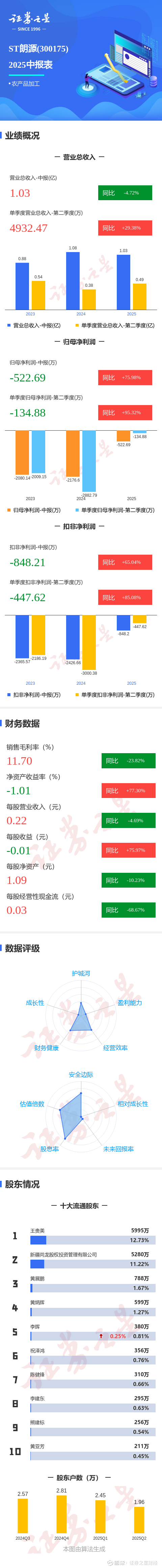 证券之星消息,ST朗源2025年中报显示,公司主营收入1.03亿元,同比下降4.72%;归母净利润-522.69万元,同比上升75.99%;扣非净利润-848.21万元,同比上升65.05%;其中2025年第二季度,公司单季度主营收入4932.47万元,同比上升29.38%;单季度归母净利润-134.88万元,同比上升95.32%;单季度扣非净利润-447.62万元,同比上升85.08%;负债率6.19%,投资收益707.44万元,财务费用32.69万元,毛利率11.7%。