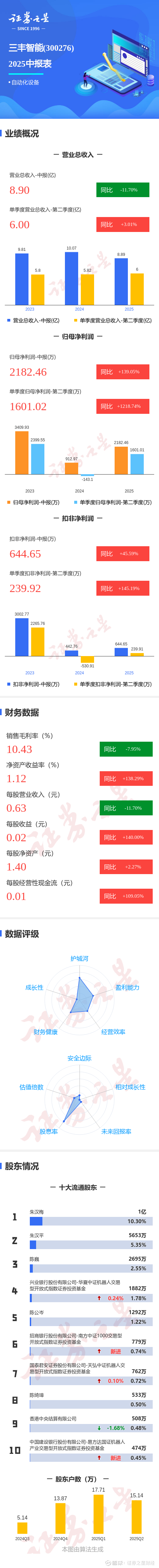 证券之星消息,三丰智能2025年中报显示,公司主营收入8.9亿元,同比下降11.7%;归母净利润2182.46万元,同比上升139.05%;扣非净利润644.65万元,同比上升45.6%;其中2025年第二季度,公司单季度主营收入6.0亿元,同比上升3.01%;单季度归母净利润1601.02万元,同比上升1218.75%;单季度扣非净利润239.92万元,同比上升145.19%;负债率52.71%,投资收益1362.3万元,财务费用-183.55万元,毛利率10.43%。
