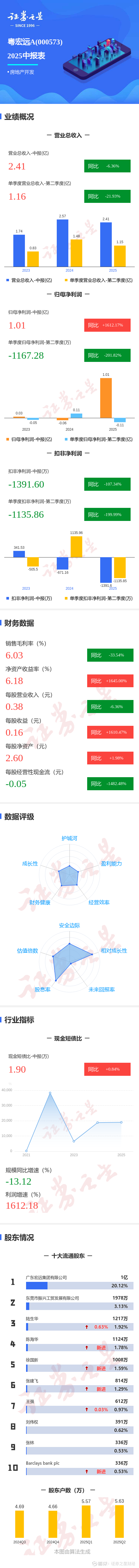 证券之星消息,粤宏远A2025年中报显示,公司主营收入2.41亿元,同比下降6.36%;归母净利润1.01亿元,同比上升1612.18%;扣非净利润-1391.6万元,同比下降107.34%;其中2025年第二季度,公司单季度主营收入1.16亿元,同比下降21.93%;单季度归母净利润-1167.28万元,同比下降201.82%;单季度扣非净利润-1135.86万元,同比下降199.99%;负债率27.75%,投资收益1.24亿元,财务费用707.92万元,毛利率6.03%。