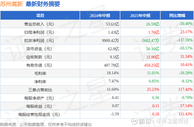 据证券之星公开数据整理,近期苏州高新(600736)发布2025年中报。截至本报告期末,公司营业总收入26.59亿元,同比下降50.4%,归母净利润1.76亿元,同比上升23.17%。按单季度数据看,第二季度营业总收入10.73亿元,同比下降5.98%,第二季度归母净利润2869.05万元,同比下降7.44%。本报告期苏州高新三费占比上升明显,财务费用、销售费用和管理费用总和占总营收同比增幅达117.42%。