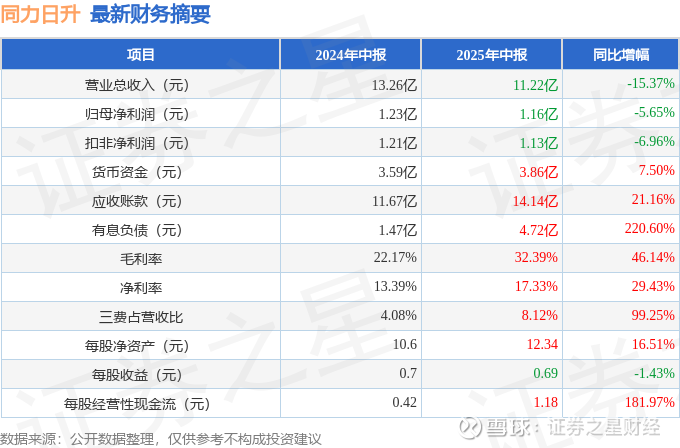 据证券之星公开数据整理,近期同力日升(605286)发布2025年中报。截至本报告期末,公司营业总收入11.22亿元,同比下降15.37%,归母净利润1.16亿元,同比下降5.65%。按单季度数据看,第二季度营业总收入5.79亿元,同比下降31.07%,第二季度归母净利润4324.88万元,同比下降46.9%。本报告期同力日升盈利能力上升,毛利率同比增幅46.53%,净利率同比增幅29.43%。