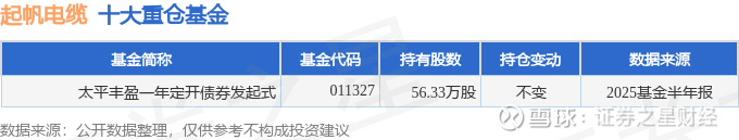 建议关注公司现金流状况(货币资金/流动负债仅为18.92%、近3年经营性现金流均值/流动负债仅为-4.33%)建议关注公司债务状况(有息资产负债率已达46.96%、近3年经营性现金流均值为负)建议关注财务费用状况(近3年经营活动产生的现金流净额均值为负)建议关注公司应收账款状况(应收账款/利润已达3307.1%)持有起帆电缆最多的基金为太平丰盈一年定开债券发起式,目前规模为30.9亿元,最新净值1.0834(8月28日),较上一交易日下跌0.18%,近一年上涨15.88%。该基金现任基金经理为史彦刚。