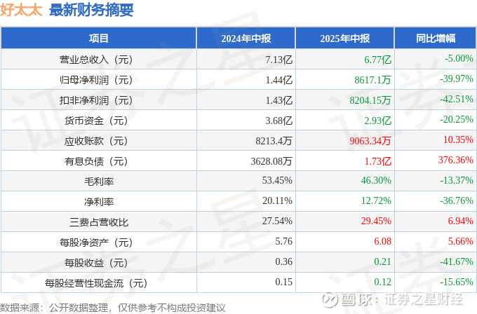 据证券之星公开数据整理,近期好太太(603848)发布2025年中报。根据财报显示,好太太净利润同比下降39.97%。截至本报告期末,公司营业总收入6.77亿元,同比下降5.0%,归母净利润8617.1万元,同比下降39.97%。按单季度数据看,第二季度营业总收入4.18亿元,同比下降0.58%,第二季度归母净利润5269.31万元,同比下降40.12%。