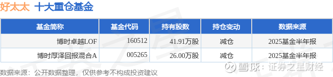 业务评价:公司去年的ROIC为8.33%,资本回报率一般。去年的净利率为15.94%,算上全部成本后,公司产品或服务的附加值高。从历史年报数据统计来看,公司上市以来中位数ROIC为20.73%,投资回报也很好,其中最惨年份2024年的ROIC为8.33%,投资回报也较好。公司历史上的财报较为好看(注:公司上市时间不满10年,上市时间越长财务均分参考意义越大。)。商业模式:公司业绩主要依靠营销驱动。需要仔细研究这类驱动力背后的实际情况。持有好太太最多的基金为博时卓越LOF,目前规模为1.24亿元,最新净值2.222(8月27日),较上一交易日下跌0.67%,近一年上涨17.82%。该基金现任基金经理为冀楠。