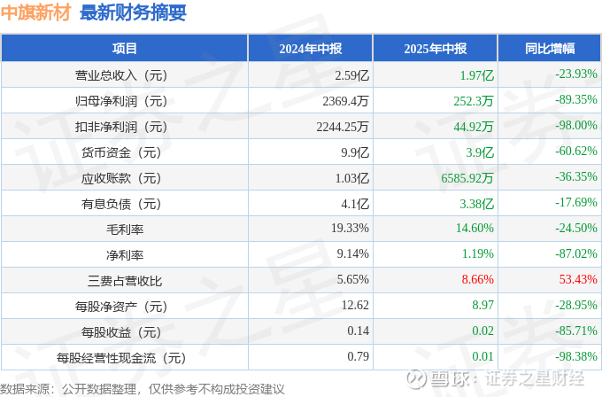 据证券之星公开数据整理,近期中旗新材(001212)发布2025年中报。截至本报告期末,公司营业总收入1.97亿元,同比下降23.93%,归母净利润252.3万元,同比下降89.35%。按单季度数据看,第二季度营业总收入1.16亿元,同比下降7.49%,第二季度归母净利润665.64万元,同比下降27.39%。本报告期中旗新材公司应收账款体量较大,当期应收账款占最新年报归母净利润比达215.85%。