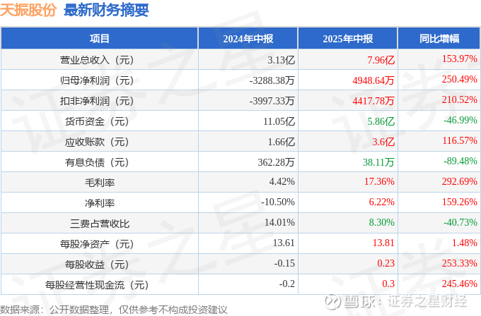 据证券之星公开数据整理,近期天振股份(301356)发布2025年中报。截至本报告期末,公司营业总收入7.96亿元,同比上升153.97%,归母净利润4948.64万元,同比上升250.49%。按单季度数据看,第二季度营业总收入3.83亿元,同比上升139.8%,第二季度归母净利润2201.38万元,同比上升196.13%。本报告期天振股份盈利能力上升,毛利率同比增幅292.69%,净利率同比增幅159.26%。