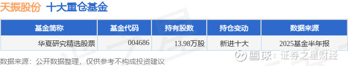 建议关注公司应收账款状况(年报归母净利润为负)持有天振股份最多的基金为华夏研究精选股票,目前规模为1.19亿元,最新净值1.6399(8月28日),较上一交易日上涨1.87%,近一年上涨33.15%。该基金现任基金经理为刘文成。