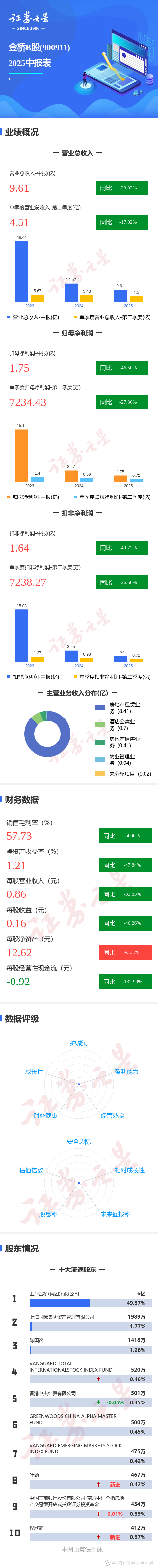 证券之星消息,金桥B股2025年中报显示,公司主营收入9.61亿元,同比下降33.84%;归母净利润1.75亿元,同比下降46.51%;扣非净利润1.64亿元,同比下降49.73%;其中2025年第二季度,公司单季度主营收入4.51亿元,同比下降17.03%;单季度归母净利润7234.43万元,同比下降27.37%;单季度扣非净利润7238.27万元,同比下降26.51%;负债率63.66%,投资收益2175.91万元,财务费用1.8亿元,毛利率57.73%。