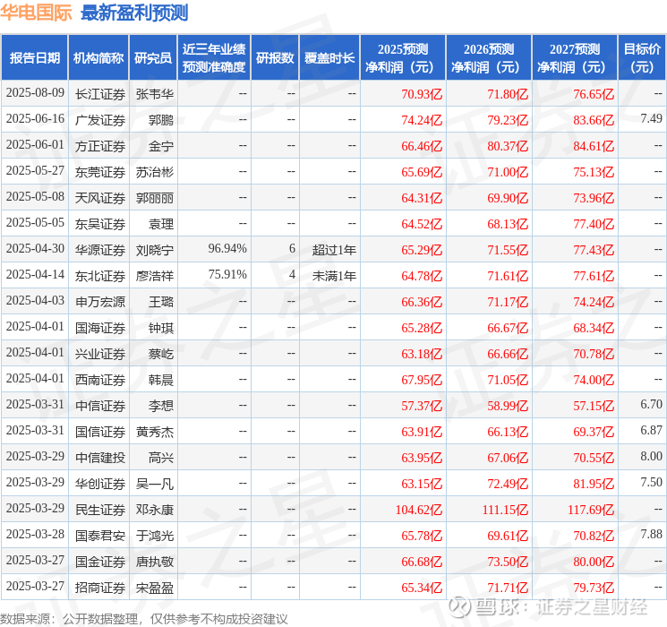最新盈利预测明细如下: