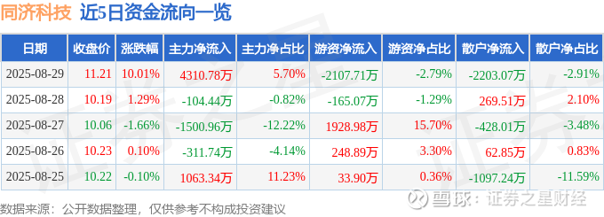 证券之星消息,同济科技8月29日涨停收盘,收盘价11.21元。该股于14点0分涨停,2次打开涨停,截止收盘封单资金为4792.07万元,占其流通市值0.68%。