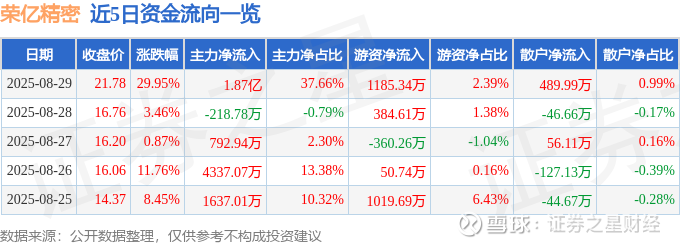 证券之星消息,荣亿精密8月29日涨停收盘,收盘价21.78元。该股于10点3分涨停,1次打开涨停,截止收盘封单资金为3849.41万元,占其流通市值2.17%。