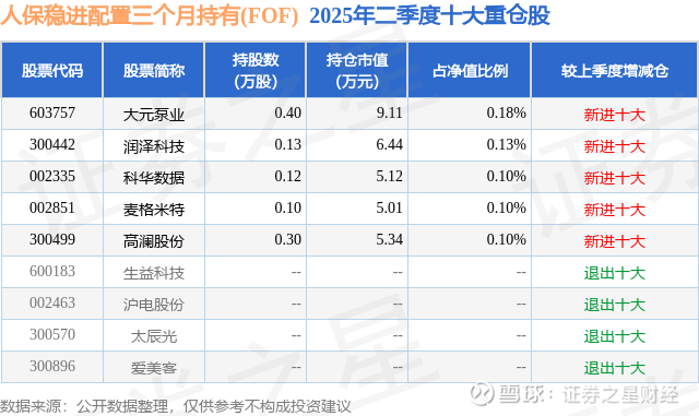 根据2025基金半年报公募基金重仓股数据,重仓该股的公募基金共2家,其中持有数量最多的公募基金为人保资产的人保稳进配置三个月持有(FOF)。人保稳进配置三个月持有(FOF)目前规模为0.51亿元,最新净值1.029(8月27日),较上一交易日下跌0.41%,近一年上涨8.66%。该公募基金现任基金经理为叶忻。叶忻在任的基金产品包括:人保泰睿积极配置三个月持有混合发起式(FOF)A,管理时间为2024年4月26日至今,期间收益率为28.01%;人保泰和积极配置三个月持有混合发起式(FOF)A,管理时间为2024年11月20日至今,期间收益率为17.12%。