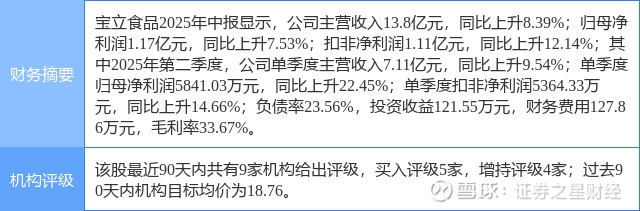 今日宝立食品(603170)涨6.03%,收盘报14.59元。