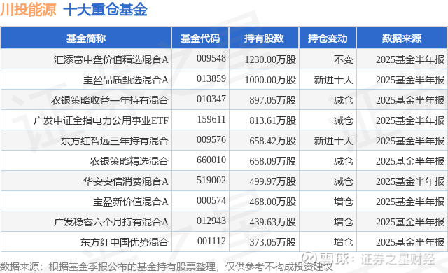 重仓川投能源的前十大公募基金请见下表: