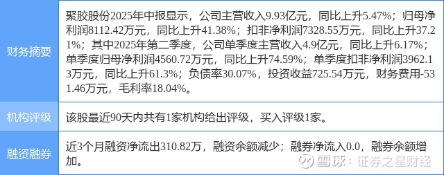 2025年8月28日,山西证券研究员李旋坤,王金源发布了对聚胶股份的研报《卫材热熔胶25Q2淡季不淡,超强格局下持续成长》,该研报对聚胶股份给出“买入”评级。证券之星数据中心根据近三年发布的研报数据计算,该研报作者对此股的盈利预测准确度为49.29%。