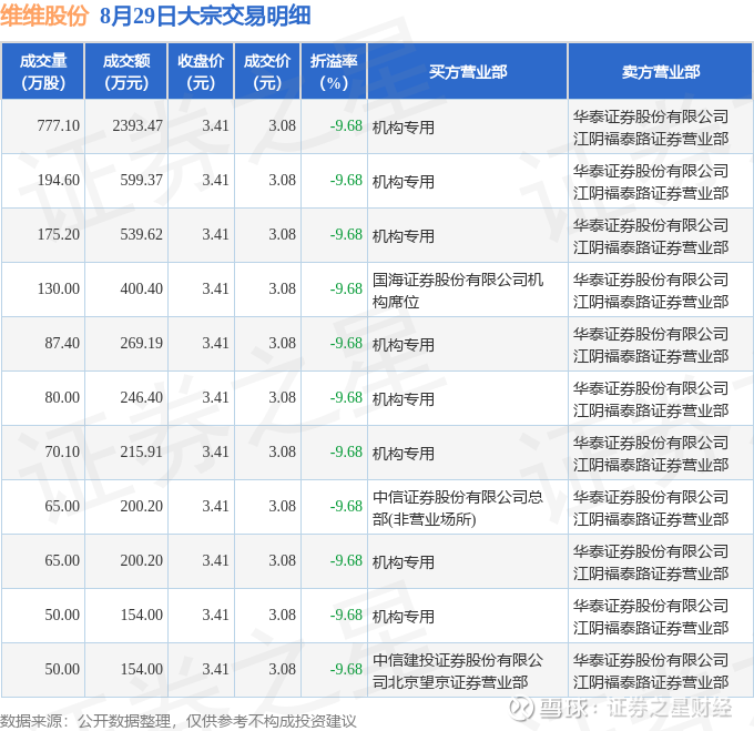 证券之星消息,8月29日维维股份发生大宗交易,交易数据如下: