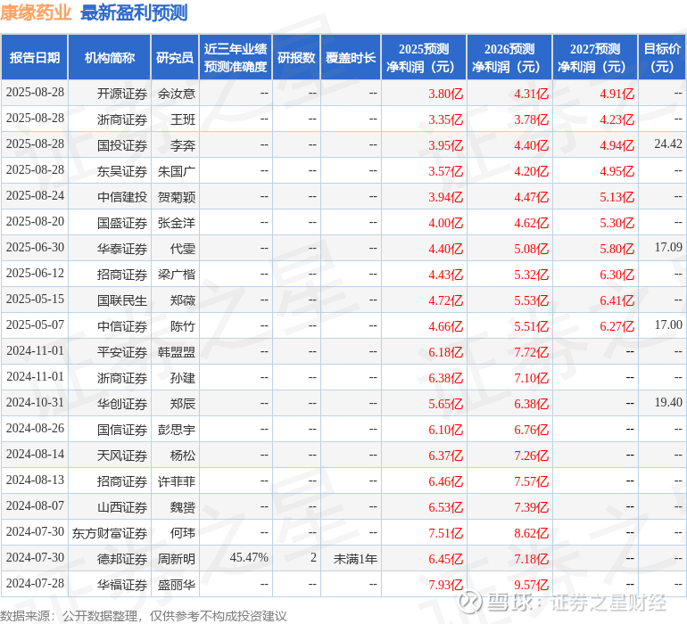 最新盈利预测明细如下: