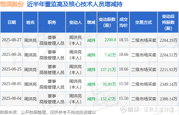 证券之星消息,根据8月29日市场公开信息、上市公司公告及交易所披露数据整理,恒润股份(603985)最新董监高及相关人员股份变动情况:2025年8月27日公司董事,高级管理人员周洪亮共减持公司股份2200.0股,占公司总股本为0.0005%。变动期间公司股价下跌3.88%,8月27日当日收盘报17.85元。
