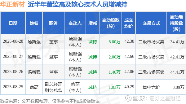 华正新材近半年内的董监高及核心技术人员增减持详情如下: