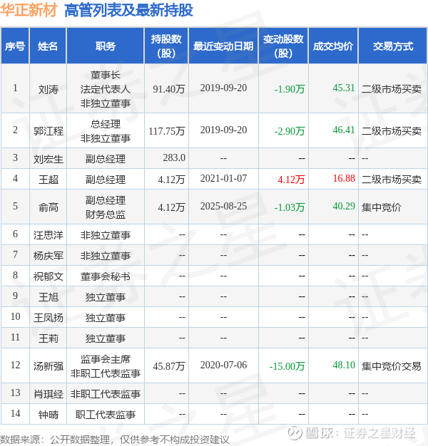 华正新材的高管列表及最新持股情况如下:
