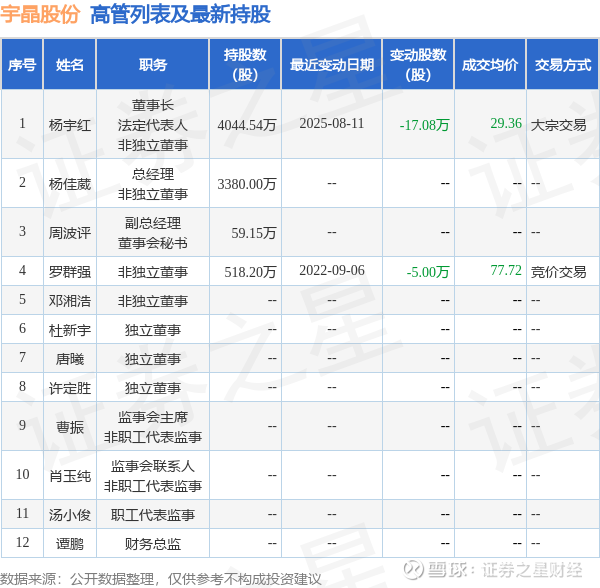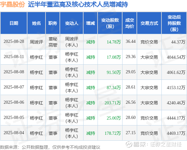 宇晶股份近半年内的董监高及核心技术人员增减持详情如下: