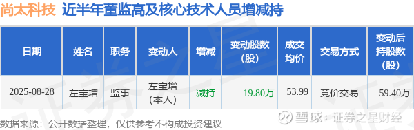 证券之星消息,根据8月29日市场公开信息、上市公司公告及交易所披露数据整理,尚太科技(001301)最新董监高及相关人员股份变动情况:2025年8月28日公司监事左宝增共减持公司股份19.8万股,占公司总股本为0.0759%。变动期间公司股价上涨0.57%,8月28日当日收盘报54.83元。