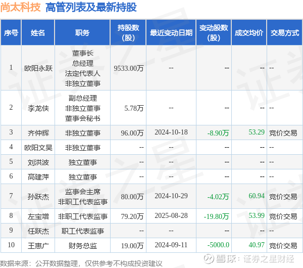 尚太科技的高管列表及最新持股情况如下: