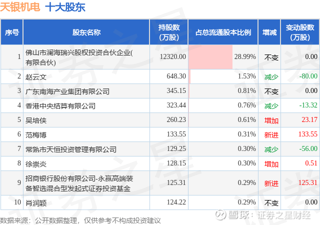 证券之星消息,8月29日天银机电发布公告《天银机电:关于控股股东减持股份触及1%整数倍暨减持计划实施完成的公告》,其股东佛山市澜海瑞兴股权投资合伙企业(有限合伙)于2025年7月29日至2025年8月28日间合计减持830.39万股,占公司目前总股本的1.9537%,变动期间该股股价上涨12.8%,截止8月28日收盘报19.91元。