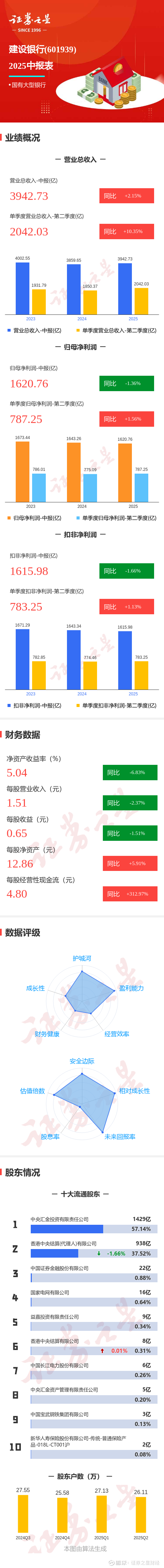证券之星消息,建设银行2025年中报显示,公司主营收入3942.73亿元,同比上升2.15%;归母净利润1620.76亿元,同比下降1.37%;扣非净利润1615.98亿元,同比下降1.66%;其中2025年第二季度,公司单季度主营收入2042.03亿元,同比上升10.36%;单季度归母净利润787.25亿元,同比上升1.57%;单季度扣非净利润783.25亿元,同比上升1.13%;负债率91.93%,投资收益279.12亿元。