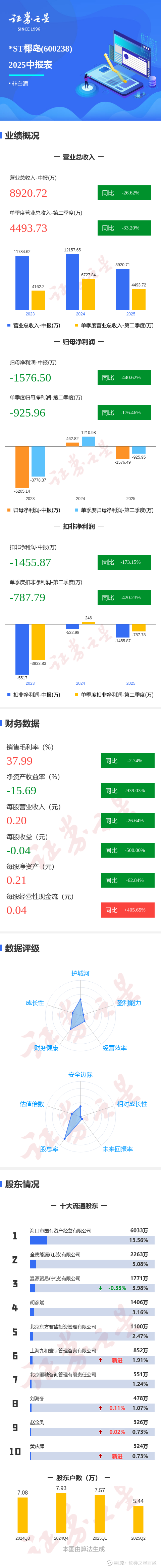 证券之星消息,*ST椰岛2025年中报显示,公司主营收入8920.72万元,同比下降26.62%;归母净利润-1576.5万元,同比下降440.62%;扣非净利润-1455.87万元,同比下降173.15%;其中2025年第二季度,公司单季度主营收入4493.73万元,同比下降33.21%;单季度归母净利润-925.96万元,同比下降176.46%;单季度扣非净利润-787.79万元,同比下降420.23%;负债率85.86%,投资收益-101.66万元,财务费用798.26万元,毛利率37.99%。