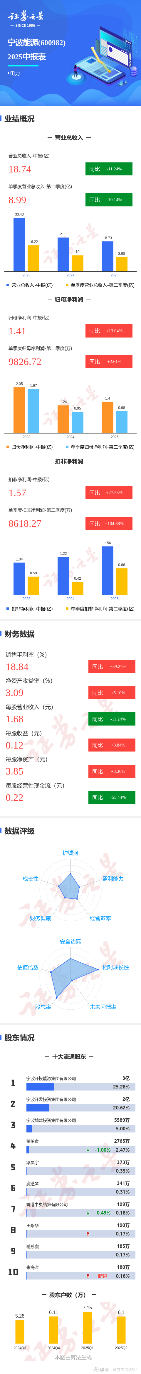 证券之星消息,宁波能源2025年中报显示,公司主营收入18.74亿元,同比下降11.24%;归母净利润1.41亿元,同比上升13.05%;扣非净利润1.57亿元,同比上升27.56%;其中2025年第二季度,公司单季度主营收入8.99亿元,同比下降10.15%;单季度归母净利润9826.72万元,同比上升2.61%;单季度扣非净利润8618.27万元,同比上升104.69%;负债率64.45%,投资收益1.35亿元,财务费用8150.71万元,毛利率18.84%。
