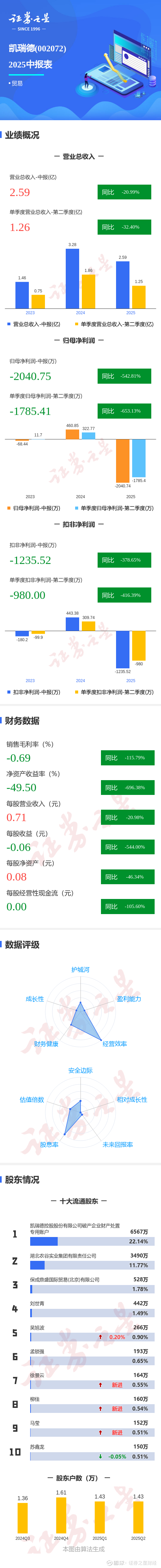 证券之星消息,凯瑞德2025年中报显示,公司主营收入2.59亿元,同比下降20.99%;归母净利润-2040.75万元,同比下降542.81%;扣非净利润-1235.52万元,同比下降378.66%;其中2025年第二季度,公司单季度主营收入1.26亿元,同比下降32.41%;单季度归母净利润-1785.41万元,同比下降653.14%;单季度扣非净利润-980.0万元,同比下降416.39%;负债率63.04%,投资收益0.0万元,财务费用4.56万元,毛利率-0.69%。