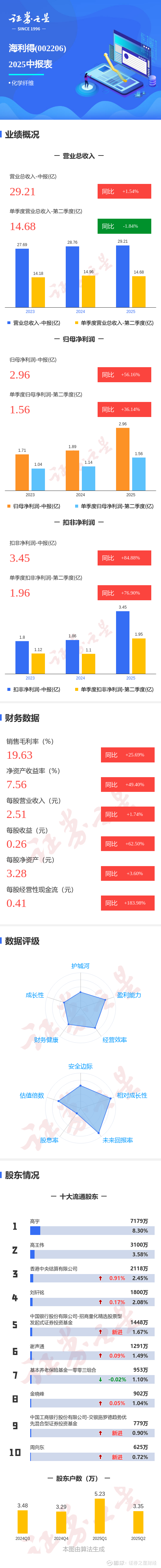 证券之星消息,海利得2025年中报显示,公司主营收入29.21亿元,同比上升1.55%;归母净利润2.96亿元,同比上升56.16%;扣非净利润3.45亿元,同比上升84.88%;其中2025年第二季度,公司单季度主营收入14.68亿元,同比下降1.85%;单季度归母净利润1.56亿元,同比上升36.14%;单季度扣非净利润1.96亿元,同比上升76.91%;负债率47.42%,投资收益-3437.46万元,财务费用-4352.93万元,毛利率19.63%。