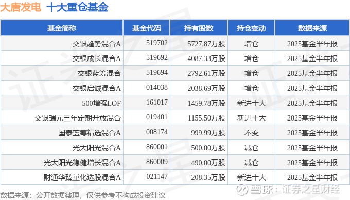 持有大唐发电最多的基金为交银趋势混合A,目前规模为38.22亿元,最新净值4.8488(8月29日),较上一交易日上涨0.21%,近一年上涨29.47%。该基金现任基金经理为杨金金。