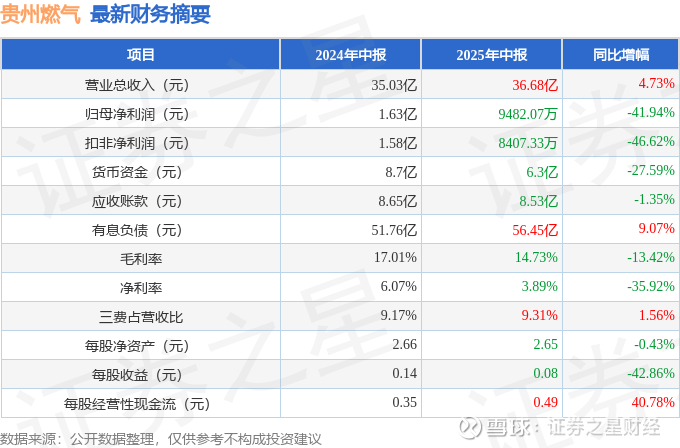据证券之星公开数据整理,近期贵州燃气(600903)发布2025年中报。截至本报告期末,公司营业总收入36.68亿元,同比上升4.73%,归母净利润9482.07万元,同比下降41.94%。按单季度数据看,第二季度营业总收入13.75亿元,同比下降6.67%,第二季度归母净利润2330.15万元,同比下降62.12%。本报告期贵州燃气短期债务压力上升,流动比率达0.72。