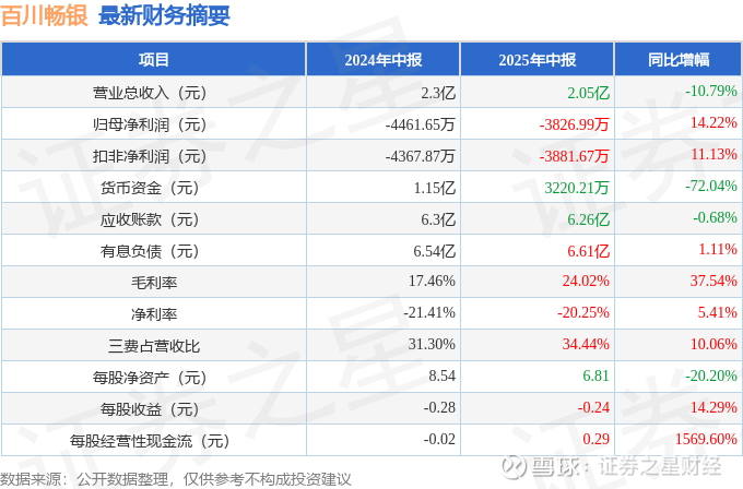 据证券之星公开数据整理,近期百川畅银(300614)发布2025年中报。截至本报告期末,公司营业总收入2.05亿元,同比下降10.79%,归母净利润-3826.99万元,同比上升14.22%。按单季度数据看,第二季度营业总收入9703.16万元,同比下降14.47%,第二季度归母净利润-2659.46万元,同比下降12.32%。本报告期百川畅银盈利能力上升,毛利率同比增幅37.54%,净利率同比增幅5.41%。
