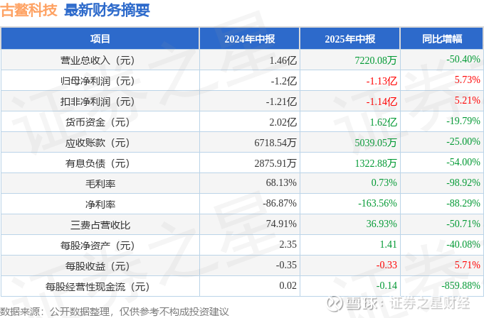 据证券之星公开数据整理,近期古鳌科技(300551)发布2025年中报。根据财报显示,古鳌科技亏损收窄。截至本报告期末,公司营业总收入7220.08万元,同比下降50.4%,归母净利润-1.13亿元,同比上升5.73%。按单季度数据看,第二季度营业总收入4747.31万元,同比下降37.05%,第二季度归母净利润-6295.5万元,同比上升20.14%。