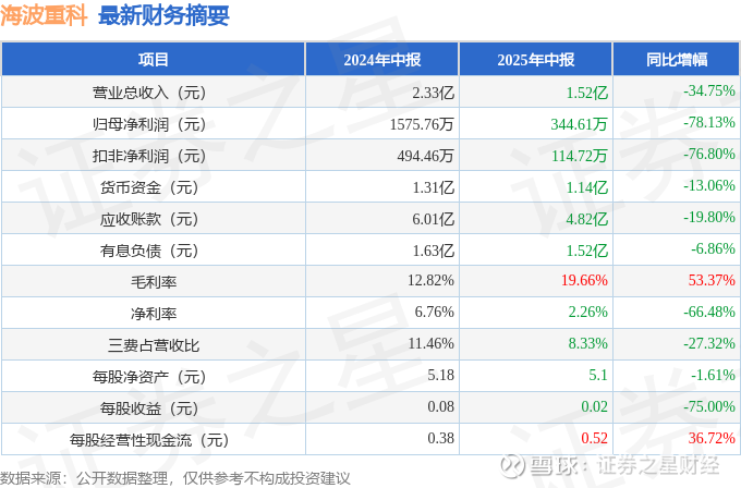 据证券之星公开数据整理,近期海波重科(300517)发布2025年中报。截至本报告期末,公司营业总收入1.52亿元,同比下降34.75%,归母净利润344.61万元,同比下降78.13%。按单季度数据看,第二季度营业总收入6550.3万元,同比下降48.87%,第二季度归母净利润279.76万元,同比上升15.68%。本报告期海波重科公司应收账款体量较大,当期应收账款占最新年报归母净利润比达2096.71%。