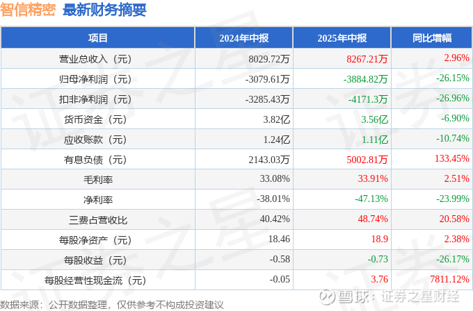 据证券之星公开数据整理,近期智信精密(301512)发布2025年中报。截至本报告期末,公司营业总收入8267.21万元,同比上升2.96%,归母净利润-3884.82万元,同比下降26.15%。按单季度数据看,第二季度营业总收入5462.06万元,同比上升45.29%,第二季度归母净利润-1752.72万元,同比上升15.57%。本报告期智信精密公司应收账款体量较大,当期应收账款占最新年报归母净利润比达243.18%。