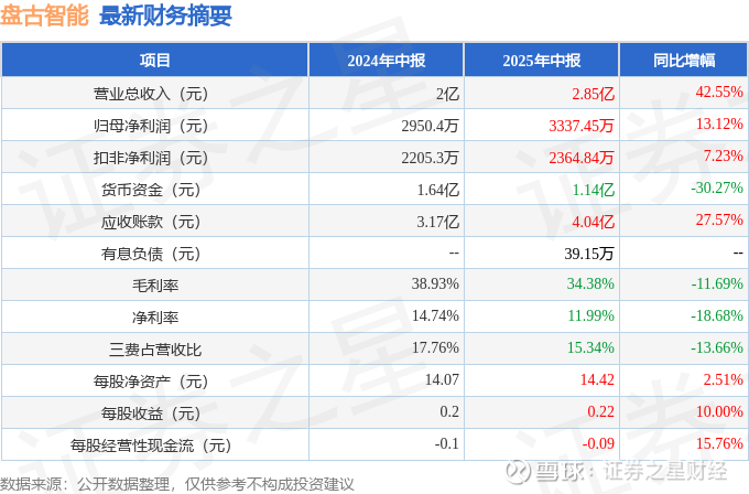 据证券之星公开数据整理,近期盘古智能(301456)发布2025年中报。截至本报告期末,公司营业总收入2.85亿元,同比上升42.55%,归母净利润3337.45万元,同比上升13.12%。按单季度数据看,第二季度营业总收入1.68亿元,同比上升41.92%,第二季度归母净利润2030.0万元,同比上升24.72%。本报告期盘古智能公司应收账款体量较大,当期应收账款占最新年报归母净利润比达645.92%。