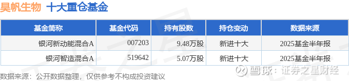 持有昊帆生物最多的基金为银河新动能混合A,目前规模为1.77亿元,最新净值2.0134(8月29日),较上一交易日上涨0.16%,近一年上涨64.49%。该基金现任基金经理为鲍武斌。