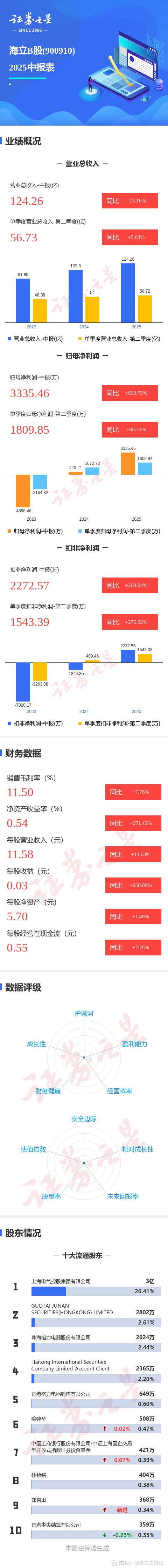 证券之星消息,海立B股2025年中报显示,公司主营收入124.26亿元,同比上升13.16%;归母净利润3335.46万元,同比上升693.76%;扣非净利润2272.57万元,同比上升269.05%;其中2025年第二季度,公司单季度主营收入56.73亿元,同比上升5.03%;单季度归母净利润1809.85万元,同比上升68.71%;单季度扣非净利润1543.39万元,同比上升276.93%;负债率67.84%,投资收益-2307.67万元,财务费用-3126.52万元,毛利率11.5%。