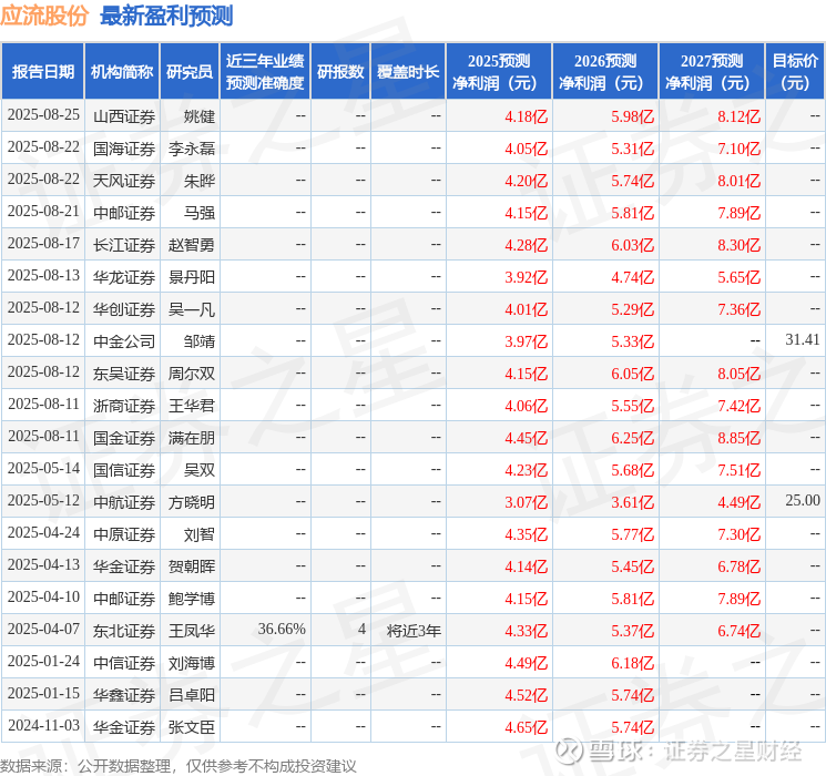 最新盈利预测明细如下: