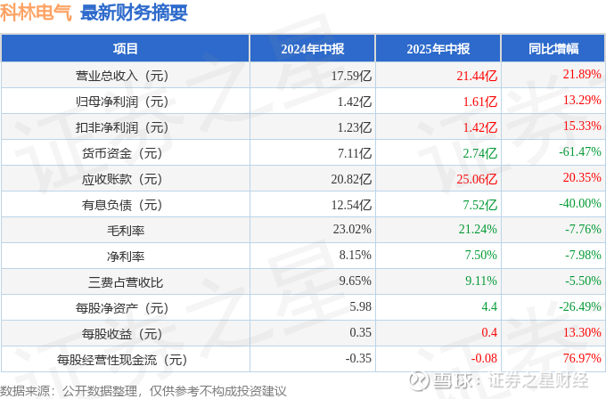 据证券之星公开数据整理,近期科林电气(603050)发布2025年中报。截至本报告期末,公司营业总收入21.44亿元,同比上升21.89%,归母净利润1.61亿元,同比上升13.29%。按单季度数据看,第二季度营业总收入12.32亿元,同比上升22.39%,第二季度归母净利润8809.73万元,同比上升17.83%。本报告期科林电气公司应收账款体量较大,当期应收账款占最新年报归母净利润比达1409.01%。