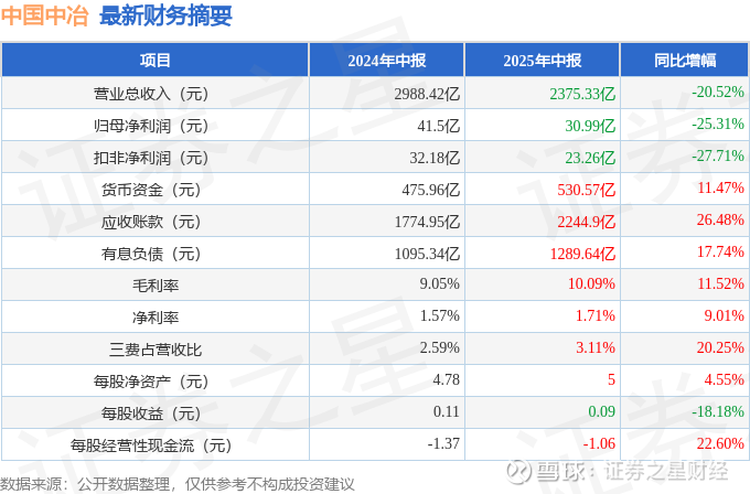 据证券之星公开数据整理,近期中国中冶(601618)发布2025年中报。截至本报告期末,公司营业总收入2375.33亿元,同比下降20.52%,归母净利润30.99亿元,同比下降25.31%。按单季度数据看,第二季度营业总收入1152.6亿元,同比下降22.59%,第二季度归母净利润14.92亿元,同比上升1.43%。本报告期中国中冶盈利能力上升,毛利率同比增幅11.52%,净利率同比增幅9.01%。