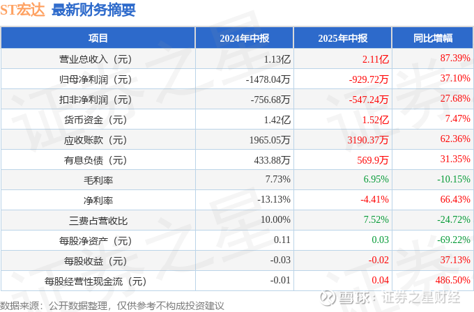 据证券之星公开数据整理,近期ST宏达(002211)发布2025年中报。根据财报显示,ST宏达营收上升亏损收窄。截至本报告期末,公司营业总收入2.11亿元,同比上升87.39%,归母净利润-929.72万元,同比上升37.1%。按单季度数据看,第二季度营业总收入1.13亿元,同比上升70.79%,第二季度归母净利润-601.79万元,同比上升53.97%。
