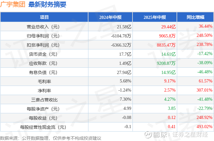 据证券之星公开数据整理,近期广宇集团(002133)发布2025年中报。截至本报告期末,公司营业总收入29.44亿元,同比上升36.44%,归母净利润9065.8万元,同比上升248.5%。按单季度数据看,第二季度营业总收入20.78亿元,同比上升154.83%,第二季度归母净利润1.29亿元,同比上升299.98%。本报告期广宇集团盈利能力上升,毛利率同比增幅61.57%,净利率同比增幅307.01%。