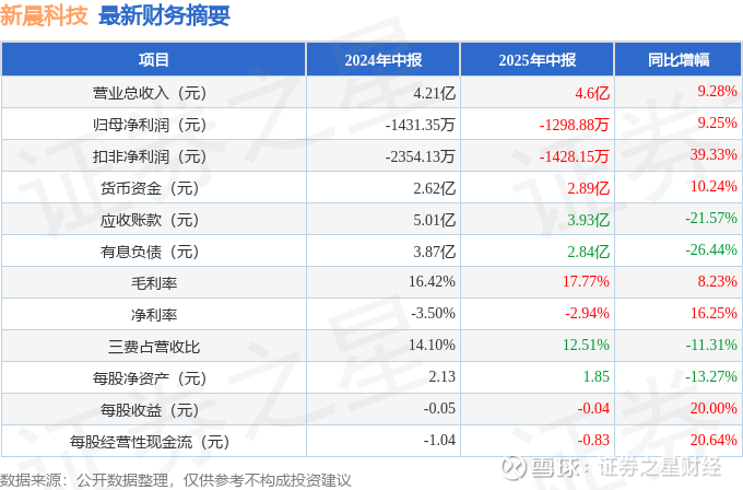 据证券之星公开数据整理,近期新晨科技(300542)发布2025年中报。截至本报告期末,公司营业总收入4.6亿元,同比上升9.28%,归母净利润-1298.88万元,同比上升9.25%。按单季度数据看,第二季度营业总收入3.36亿元,同比上升46.17%,第二季度归母净利润-672.55万元,同比下降507.66%。本报告期新晨科技盈利能力上升,毛利率同比增幅8.23%,净利率同比增幅16.25%。