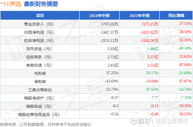据证券之星公开数据整理,近期*ST声迅(003004)发布2025年中报。截至本报告期末,公司营业总收入7275.23万元,同比上升27.51%,归母净利润-1023.92万元,同比上升58.5%。按单季度数据看,第二季度营业总收入5341.9万元,同比上升42.6%,第二季度归母净利润384.25万元,同比上升127.3%。本报告期*ST声迅公司应收账款体量较大,当期应收账款占最新年报营业总收入比达111.53%。